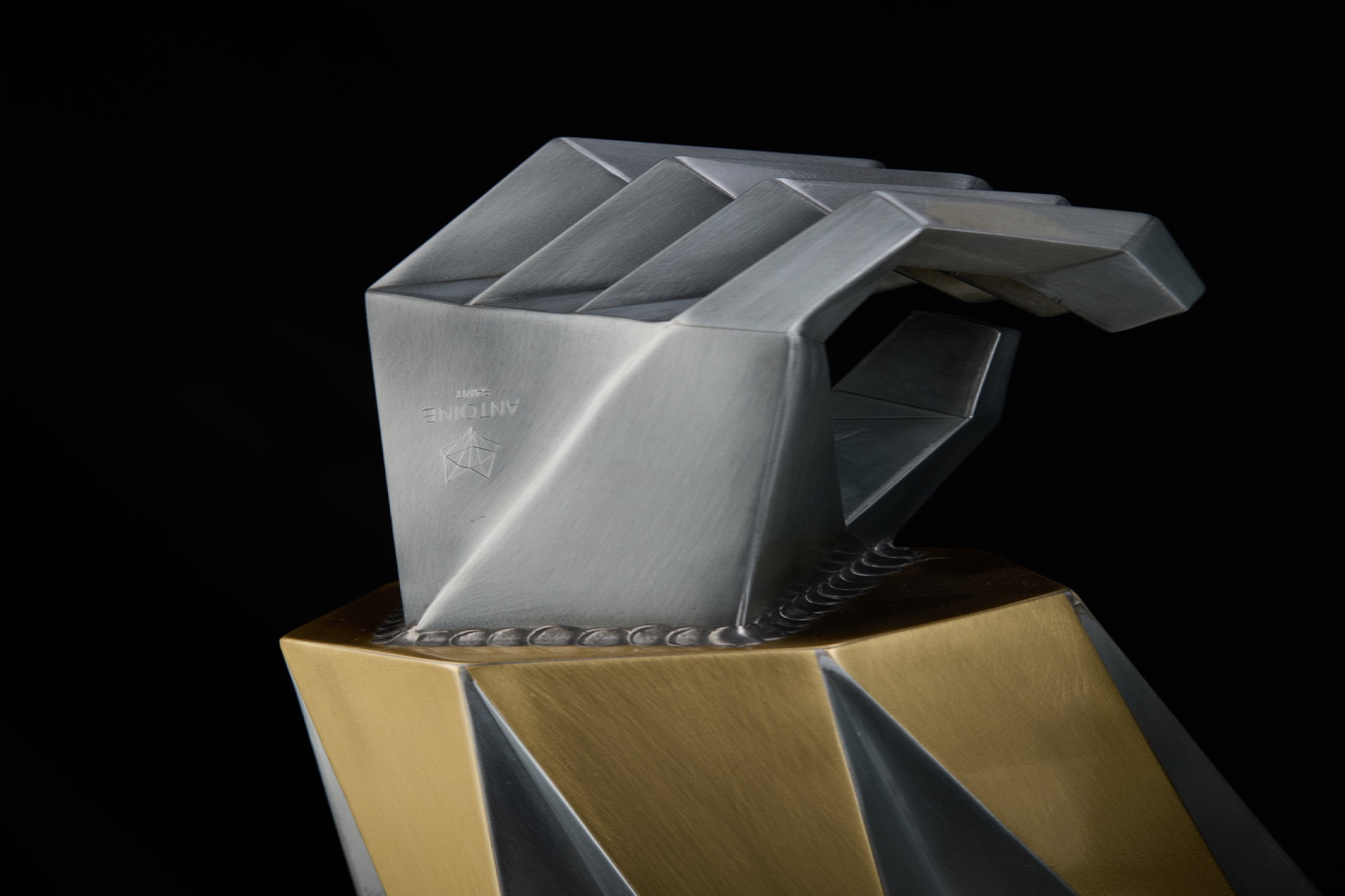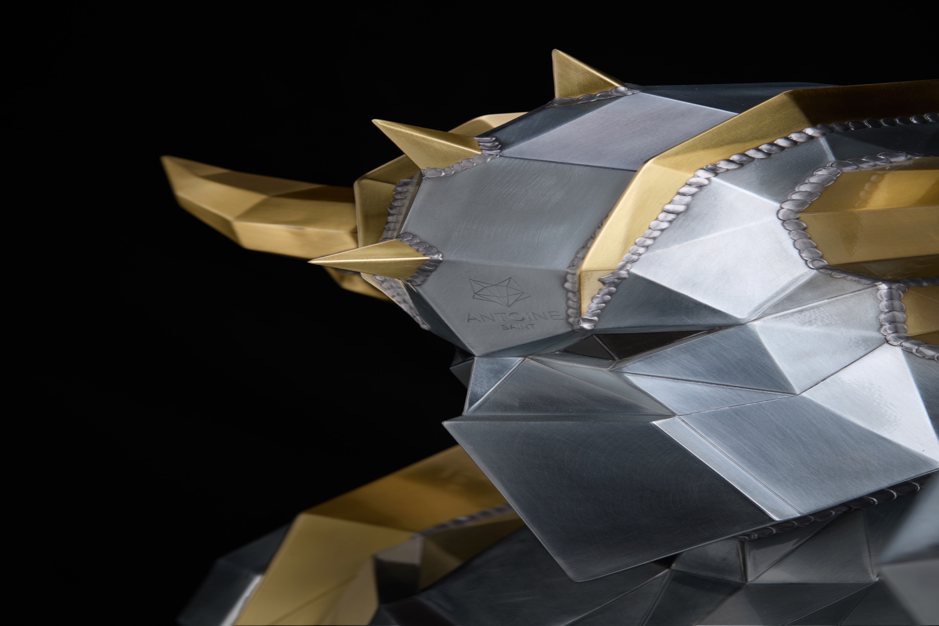 Le zinc et le laiton, travaillés avec précision, donnent vie à cette représentation où la force mécanique rencontre la retenue artistique, où chaque détail témoigne du combat figé dans le métal.
